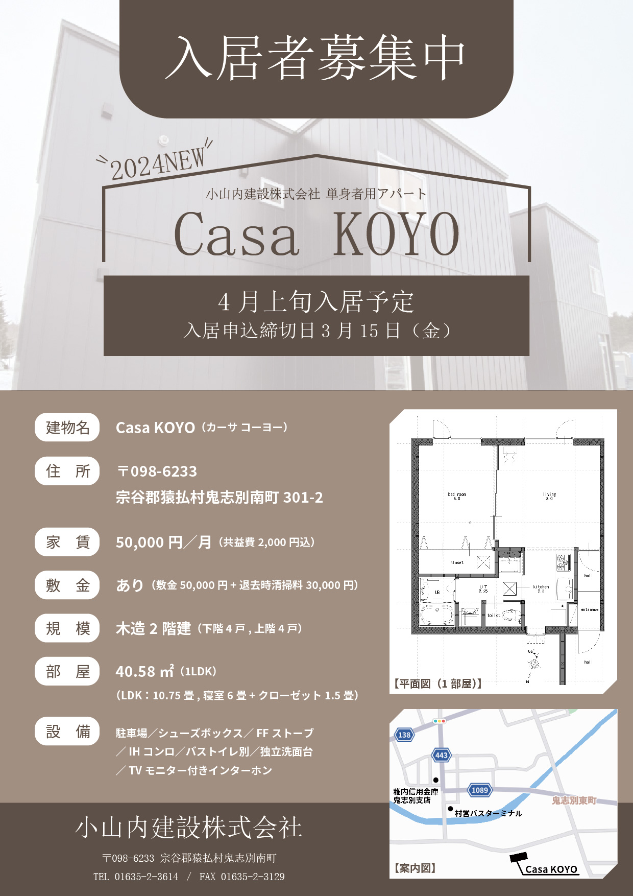 このほど小山内建設が手がけた単身者用アパート『Casa KOYO』(カーサ コーヨー)が村内の鬼志別南町に完成しました!