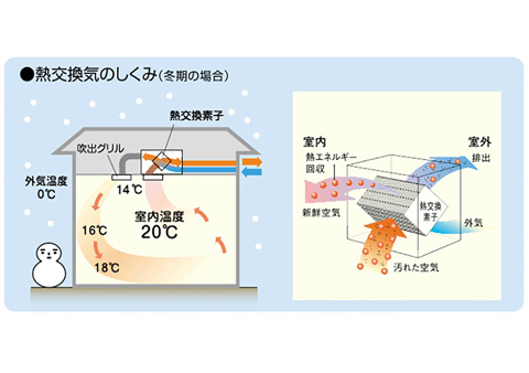 当社では給気による寒さを解消するため、給気する新鮮外気に排気する室内の汚れた空気の熱を受け渡す第1種熱交換換気システムを標準採用しています。新鮮外気が加温された状態で室内に給気されるため、寒さを感じることはなく、暖房エネルギーの削減にもつながります。