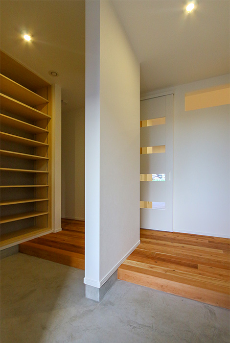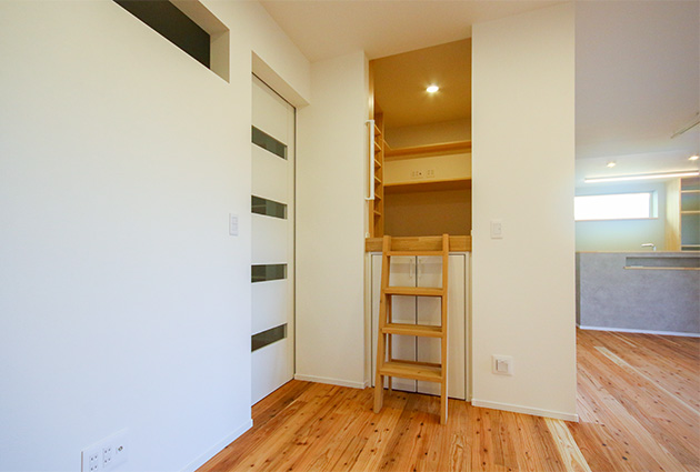 2020年(令和2年)N邸 (クリックで評価書表示) 水平基調のシンプルな平屋の外観。玄関回りは木板張りとしてアクセントを付けた フローリングの木目が印象的なLDK LDKは寝室Aと連続させると開放感ある大空間となる 遊び心あるロフト風のクローゼットもLDKに備わっている キッチン背面はモスグリーンのクロスに造作の木製収納がよく似合う キッチンは鮮やかなネイビーブルーが目を引く キッチンからリビング・ダイニングの見通しが良く、家族とのコミュニケーションも取りやすい チャコールグレー系のクロスでコーディネートした寝室Bには2つのクローゼットを用意し、1つはアコーディオン扉付き 寝室Bのもう一つのクローゼットは扉のないオープンタイプ 明るいカラーでコーディネートした客間 客間にも収納力に優れたクローゼットを設けている 間仕切り壁で動線を分けた玄関ホール。造作のシューズクローゼットにはたくさんの靴を収納できる ユーティリティの洗面化粧台も手造りで造作。シンプルなデザインが新鮮に映る 寝室と同じくストライプ柄のクロスで仕上げたトイレ