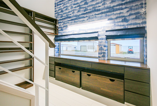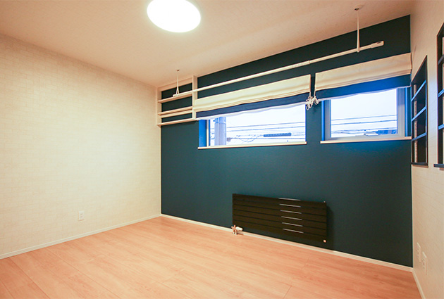 2020年(令和2年)I邸 (クリックで評価書表示) ライトカラーのサイディングとダークカラーのサイディングでコントラストを付けたスクエアな外観デザイン 約30帖の大空間となったLDK。ダウンライトによる分散照明や、スケルトンの階段が印象的 ホワイトを基調色とした中で、ダークブラウンのテレビキャビネットやレンガクロスの腰壁がアクセントになっている 適度に囲まれ感のあるキッチンは料理のしやすいレイアウトに シックな雰囲気の1階フリールーム 階段下の書斎は大人の隠れ家的な造り 玄関ポーチ回りの壁は木質感のあるサイディング仕上げ 玄関はホールまたはシューズクローゼットに通じる2ウェイ動線となっている たくさんの靴を収納できる大容量のシューズクローゼット 2階の寝室Bは壁のニッチ棚を2ヵ所に設け、クローゼットはロールスクリーンで目隠しする仕様となっている 寝室Bは壁1面に張ったダークブルーのクロスとハイサイドライト風の2連窓が特徴 寝室Cはダークブルーとライトグリーンのクロスでコーディネート。造作のロフトとデスクも備えている 寝室Dも寝室C同様にロフトがあり、写真右側の収納ボックスが階段代わりになる 寝室Eと連続するクローゼットは、中央にある機能的な収納が目を引く 主寝室となる寝室Eはグレーのクロスに囲まれた落ち着きある空間となっている 階段の踊り場には子供たちの勉強や読書にも適したカウンターデスクを造作 広々としたユーティリティは洗面化粧台も余裕のある幅広サイズ 1階ホールはシンプルモダンなイメージ 装飾ボードやタイルなどで仕上げにこだわったトイレ 艶のある木目調の壁パネルがワンランク上の居心地を提供