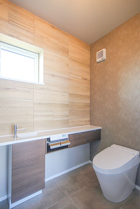 2021年(令和3年)A邸 (クリックで評価書表示) 高低差のある左右の勾配屋根が個性的な外観デザイン 間接照明が印象的なLDK。スリットで目隠ししたフローティング階段などモダンテイストな空間となっている キッチン回りは収納を背面にまとめてスッキリと使いやすく 大きな窓からカーポートの様子もよくわかる。階段下にはペット用のケージも造作 キッチンはトップライト(天窓)から入る陽射しが心地よく降り注ぐ キッチン横にはコンパクトな和室も用意 2階ホールから見下ろしたダイニングと和室 ハイサイドライトを設け、床をヘリンボーン貼りのフローリングで仕上げた1階寝室 1階寝室に隣接して4帖のクローゼットも設けた 2階の客間はコンパクトなクローゼット付き 2階は客間も寝室も淡いブルーのクロスとチェッカーガラスの室内ドアを採用 2階の寝室には間接照明を取り付け、十分な容量のクローゼットも確保 高さ違いのニッチ棚を設けた玄関 1階のホールに配置した洗面化粧台は、黒い大理石タイプでシックな雰囲気 洗面化粧台の隣には、仕切り壁を隔てて白い大理石タイプのデスクを設置。明るく清潔感があって家事用にも最適 たくさんの靴を並べて収納できるシューズクローゼット 高級感あるデザインの浴室は、テレビを見ながらのんびりお湯に浸かることができる 1階のトイレは温かみのある木目調のタイルを使って空間をコーディネート 光や太陽のイメージがあるイエローカラーのクロスが特徴的な洗濯室