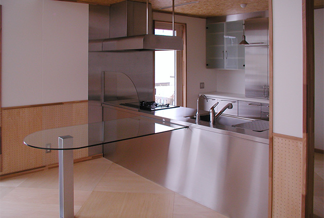 2002年(平成14年)O邸 ガルバリウム鋼板を採用した近未来的な外観 建物外観を裏手から臨む 大きな吹抜け空間としたリビング 一種のアートにも見える鋼板製の階段 キッチンもメタルテイストでまとめた 階段の踊り場横にはグレーチング風のスペースを確保 柱が立ち並ぶ2階ホール 広々として多用途に使えるロフト