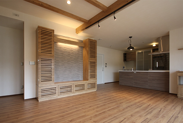 2014年(平成26年)T邸 外観は鋼板と木を張りわけたモダンデザイン LDKにはテレビの設置場所に木製キャビネットを造作 LDKと連続する和室と階段 キッチンの背面には機能的な造作収納 間仕切りやドアのないフリースペースを2階に設けた 暮らしが楽しくなるロフト付きの寝室 職人がていねいに造り上げた洗面化粧台 造作のロングデスクが便利な洋室 2階から吹抜けを見下ろしたところ 手づくりの温かみを感じる収納キャビネット 玄関にはユニークなデザインのベンチも ちょっとした家事もこなせるストックヤード