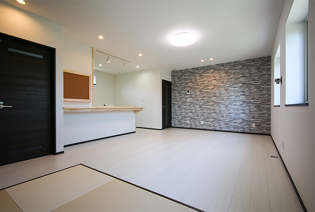2016年(平成28年)O邸 シングル葺きの屋根とクリームカラーの外装材が似合う平屋の外観 畳敷きのスペースも設けた開放的なLDK LDKの壁は一部を石目調クロスで仕上げてアクセントを付けた 造作のカウンターを設置したシンプルなキッチン 寝室Aも壁の一部分にアクセントクロスを採用 寝室Aのウォークインクローゼットは収納部分を使いやすく造作 寝室Bは壁を白木調のクロスで仕上げて心地よい雰囲気に 寝室Bはクローゼット以外に使い勝手の良い造作棚も設けた 広々したユーティリティには便利な電動物干しも設置 リラックスした雰囲気で疲れを癒すことができる浴室 タンクレス便器の採用でスッキリした空間になったトイレ