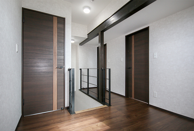 2016年(平成28年)T邸 高耐久なガルバリウム鋼板をまとったシンプルな外観 キッチンからリビング・ダイニング・和室を見通す リビングに階段があることで家族の様子もわかりやすい 和室はリビング・ダイニングとシームレスにつながる 使い勝手の良いウォークインクローゼットを備えた主寝室 濃い茶系色の柱と梁がアクセントとなっている2階ホール 間仕切りを設置すれば2部屋の個室となるロフト付きの子供部屋 ロフトは広々としたスペースを確保してある 子供部屋のクローゼットには手造りの収納棚を用意 コンクリートブロック柄のクロスが印象的なトイレ ユーティリティには便利な収納棚付きカウンターを造作 広々としていて家事を行う時も動きやすいユーティリティ 玄関はシンプルで落ち着いた雰囲気に 玄関ホールと一体の空間になった階段 壁1面に高級感あるパネルを使った浴室