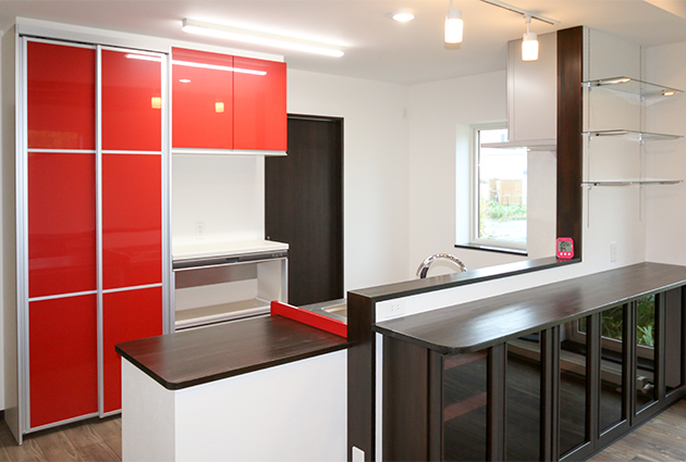 2017年(平成29年)I邸 前半分をブラウン系、後ろ半分をホワイト系の外装材で外観はガレージ部分と住居部分の外装材で貼り分けた外観 ダークブラウンの化粧梁や造作収納と、レッドのキッチンが印象的なレトロモダン風のLDK 大開口によって外光もたっぷり入る明るい空間に リビングと和室は引戸を開けることで一体的に利用できる キッチン回りの収納も十分な容量を確保 キッチンの上には吊り戸棚がないので高い開放感が得られる 色違いの畳を交互にレイアウトした和室 ユーティリティにはアイロン掛けに重宝する折畳みテーブルや造作収納を設置 天井仕上げをブラックとすることでモダンテイストを強めた主寝室 主寝室には広々したウォークインクローゼットを設けた 壁1面だけインテリアのアクセントとして柄物のクロスを使用 造作のカウンター机もある2階のフリースペース 階段の窓に自然豊かな周囲の景色が映る POPなカラーのパネルヒーターを採用した洋室 こちらの洋室は、将来、間仕切りを設けて2部屋にすることを想定 2部屋にしてもそれぞれの部屋に十分な収納を確保できる レッドカラーのドアが存在感を放つ玄関 玄関横にはシューズクローゼットを用意 スッキリと見通しの良い玄関ホール