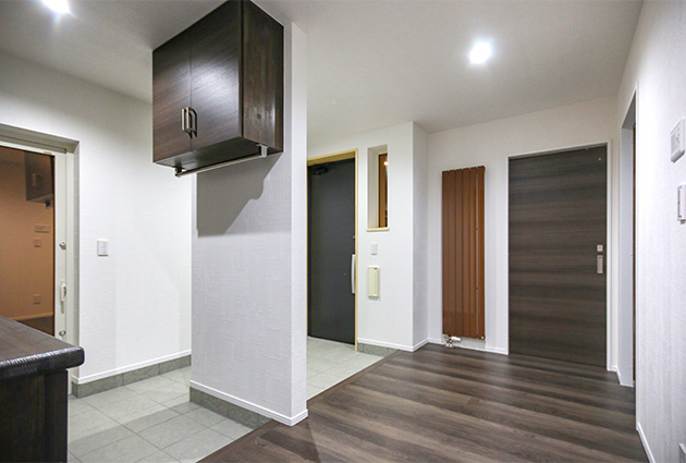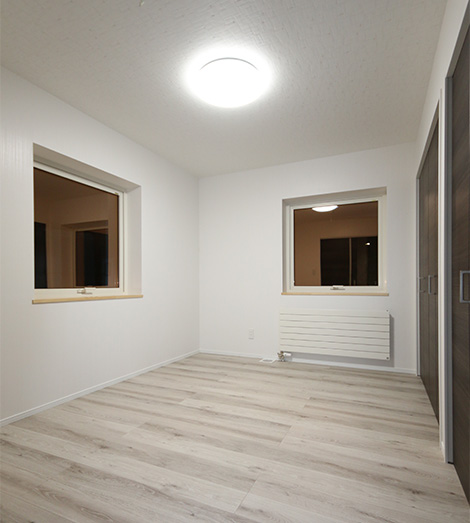 2018年(平成30年)Y邸 (クリックで評価書表示) ダークブラウンとグレーのガルバリウム鋼板で仕上げたクールな印象の外観 多灯分散照明によってリラックスできる雰囲気を醸し出すLDK。和室の扉を開け放てば約25畳の広さになる 和室は吊り戸の採用により、LDKと段差なしで連続する ボルドーレッドのカラーが目を引くキッチン 濃いブルーと淡いブルーのクロスを組み合わせてコーディネートした主寝室 主寝室は飾り棚を豊富に用意しているのも大きな特徴 主寝室と連続する大容量の収納スペース 広々した玄関はシューズクロークと一体になった設計 玄関ホールからLDKに続く廊下はホテルのような趣がある 1階のもう一つの寝室も必要十分な収納を確保 こちらの床材は明るめのコーヒークリーム色を採用 造作の収納棚を備えた2階ホール 12畳の広さがあり、ミニキッチンも用意されている2階洋室 ユーティリティは象さん柄のクロスとドット柄のクッションフロアで楽しい空間を演出 壁の1面を猫のシルエットパターンで仕上げた1階トイレ 風除室の壁・天井は木板張りでウッディな雰囲気に仕上げた