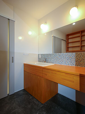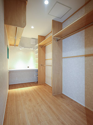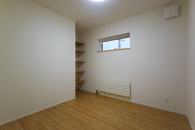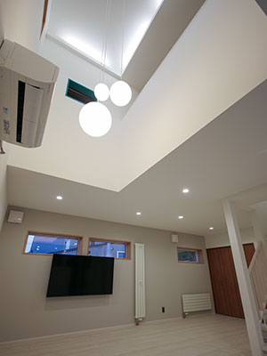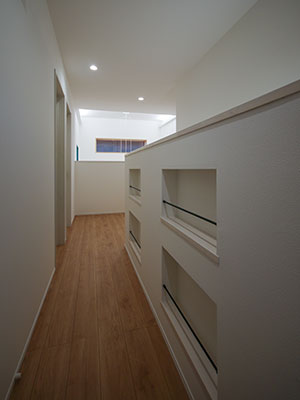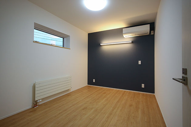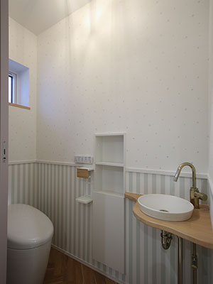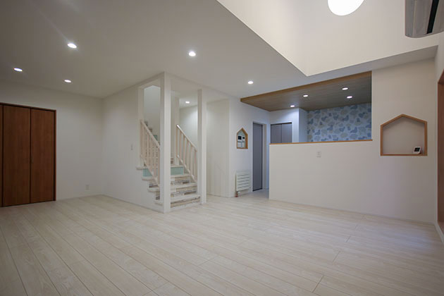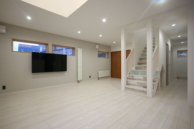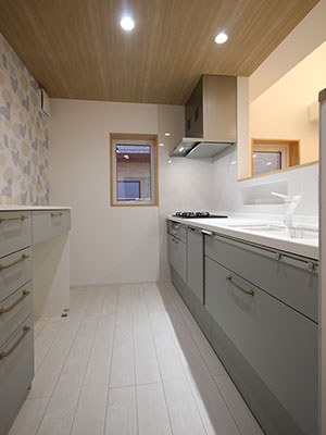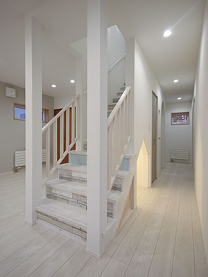 2025年(令和7年)O邸 北方型住宅2020長期優良住宅Q1.0住宅 / Q1.0-X住宅200mm断熱BELS新築 1・2階でパステルブルーとライトグレーのサイディングを張り分け、軽やかなイメージとした外観 吹抜けによって縦にも横にも空間の広がりを感じられるLDK。住宅をかたどったニッチが可愛らしい LDKの窓はハイサイドライトとすることで、プライバシーを確保しつつ陽射しを採り入れることができる LDKと2階ホールをつなぐダイナミックな吹抜け パステルグリーンのキッチンには、木目天井やデザインクロスを組み合わせた リビング階段はデザインクロスで仕上げた蹴込み板が目を引く。フローティング状の手すりも特徴的 階段下にはワンちゃんや猫ちゃんが安心して過ごせる照明付のペットコーナーを用意 玄関はアール状の垂れ壁や黄色い枠の小窓によって、柔らかで暖かいイメージに 棚板やハンガーポールが使いやすく配置されたシューズクローク 洗濯家事がメインのユーティリティは、洗濯機や衣類乾燥機、ハンガーラックの配置を工夫し家事動線を効率化 洗面化粧台があるユーティリティは、モザイクタイル仕上げや、棚などを自由に配置できるマグネット対応の壁によってデザイン性と使い勝手を高めた 洗面化粧台の反対側には家事デスクや収納棚を造作 コーナーのデッドスペースを造作の収納棚に活用した洋室A 洋室Bはグレーのアクセントクロスを採用してシックな雰囲気に仕上げた ディープブルーのアクセントクロスが印象的な寝室 寝室からは直接4帖の広さがあるクローゼットにアクセスできる クローゼットには、テレワークや趣味の作業にも使えるカウンターデスクを設けた 腰壁に4つのマガジンラックを備えている2階ホール 手洗い付の1階トイレは、腰壁を縦ストライプ柄のクロスでコーディネート ホワイトのクロスとグレーのレンガ調クロスを張り分けた2階トイレ 壁パネルのマリンブルーが鮮やかな印象を与える浴室 玄関ポーチは外壁からセットバックさせることで風雪の影響も最小限に。ウッド調の玄関ドアにある飾り窓から漏れる明かりが、家族の帰りを暖かく迎える < 前の事例へ