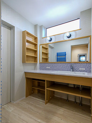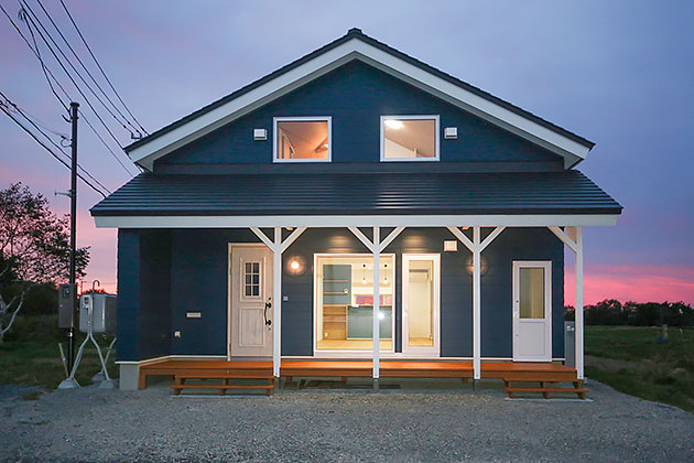 2024年(令和6年)J邸 北方型住宅2020長期優良住宅Q1.0住宅 / Q1.0-X住宅200mm断熱ZEHBELS新築 ダークブルーの金属サイディングが夕闇に映える外観。屋根には8.9kWの太陽光発電パネルも搭載している 建物正面を横切るウッドッデッキはバーベキューを始め様々な用途で活躍しそう 奥行き感のある1階中央のLDK。現しの梁・シーリングファン・キッチン造作部分をウッディカラーで統一し、壁にはヘリンボーン柄のアクセントクロスも キッチン側からLDKを見通した先に大開口を設け、空間が室内から屋外へと広がるイメージを演出 キッチンのコンロはIHクッキングヒーターを採用。料理関連グッズや小物などを収納できる造作のラックや棚も備わっている デザインブロックを使った仕切り壁やエスニック調のクロス仕上げが目を引く玄関 パントリーの壁はレンガ柄のクロスで仕上げて洋風に 階段はダークブルーの蹴込み板とブラックアイアンの手すりが印象的 鏡とカウンターの間をモザイクタイルで仕上げた造作の洗面化粧台 4帖の広さがあるユーティリティ。室内干し用のポールも設置している ホワイトウッド柄のクロスに包まれた寝室 寝室のクローゼットの中も、ボタニカルデザインのクロスで仕上げた 2階の洋室Aはミントグリーンのアクセントクロスを採用 たくさんの服を掛けておけるオープンクローゼットを備えているのも洋室Aの特徴 外壁面にグレイブルーのアクセントクロスを施工した2階の洋室B 洋室Bの収納はコンパクトなオープンクローゼットを造作 屋根断熱とすることで小屋裏に11帖弱の収納空間を確保 レトロモダンな照明でライティングされた2階ホール トイレはホワイトウッド柄のクロスと、ヘリンボーン柄のクッションフロアでコーディネート ステインブルーのアクセントパネルを採用したした浴室 < 前の事例へ次の事例へ >